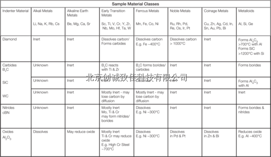 有关1940年代至60年代热硬度的文献中,存在关于安全温度范围和压头/样品材料组合物用于高温压痕的一些有限的轶事信息,但许多这种技术专长似乎已经丢失。通过将热硬度文献中剩余的有限图片与高温润湿文献中的图片相结合,可以构造出各种类型的压头/样品材料组合的反应性的一般图片–表3。